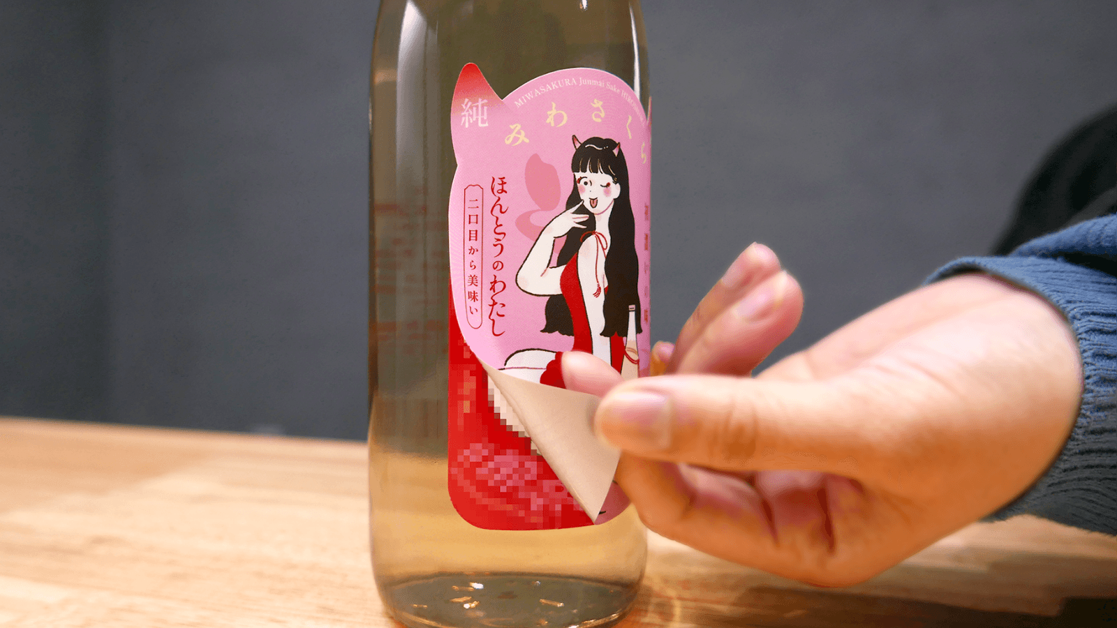 この二口目を表現する方法として、ラベルは2層式のシール構造となっています。「化けの皮をはがす」と書かれた1層目のシールをめくると『みわさくら』の本当の姿が現れます。