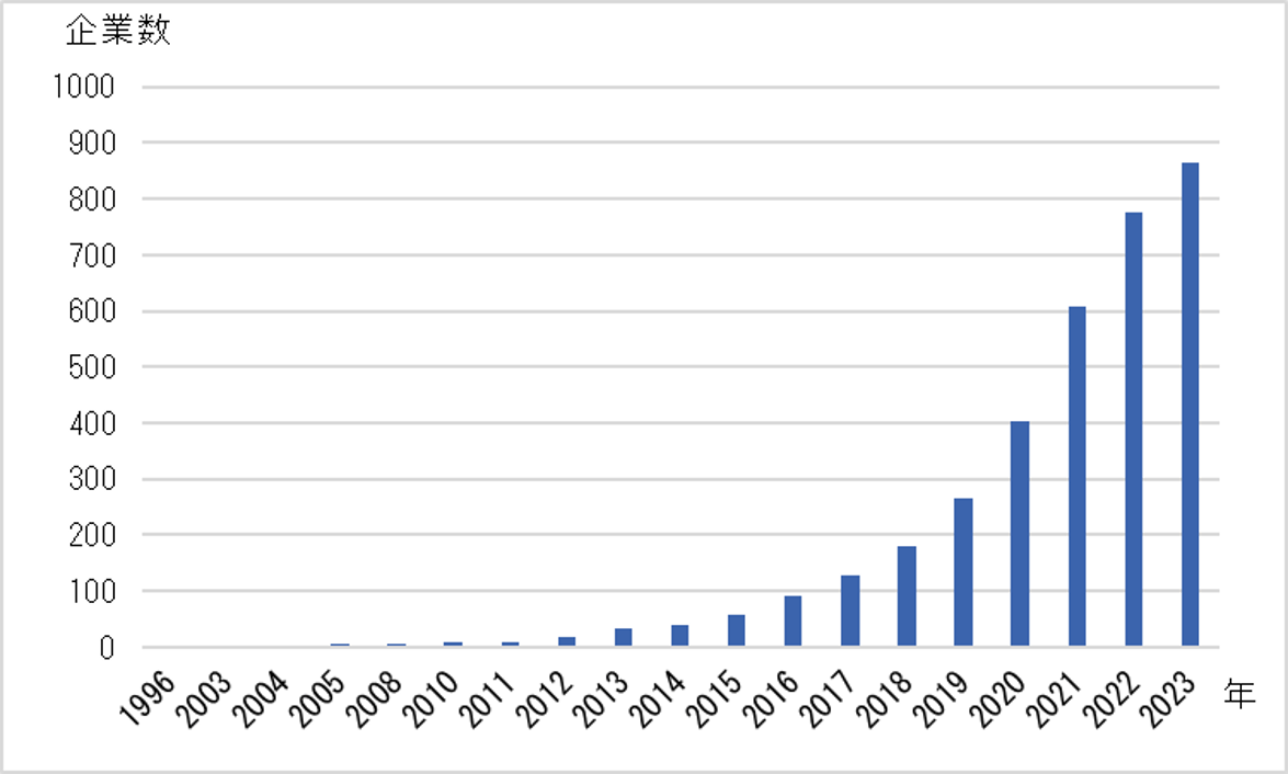 また、子会社数の推移に注目すると、1996年に株式会社ローソンが初めて中国へ進出して以来、一貫して増加傾向にあります。特に2012年頃から成長が加速していますが、成長率は2020年(+46.0%)にピークに達してから鈍化し、2023年は+7%に留まりました。(図1)