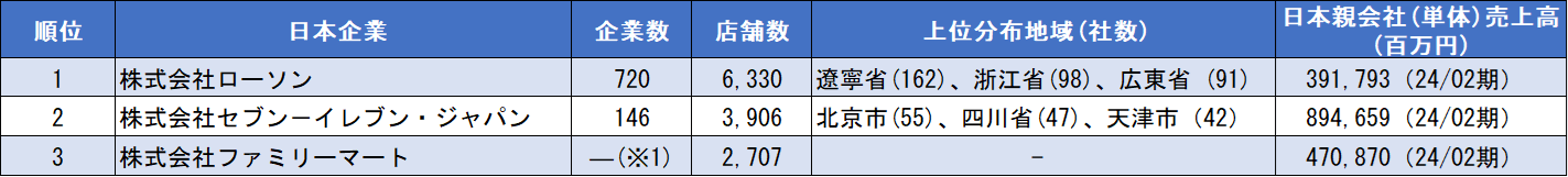中国における日系コンビニを日本の親会社と紐づけ、子会社数に基づいてランキングを作成した結果、1位「株式会社ローソン」(720社)、2位「株式会社セブン-イレブン・ジャパン」(146社)、3位「株式会社ファミリーマート」(※1)となりました。(表2)