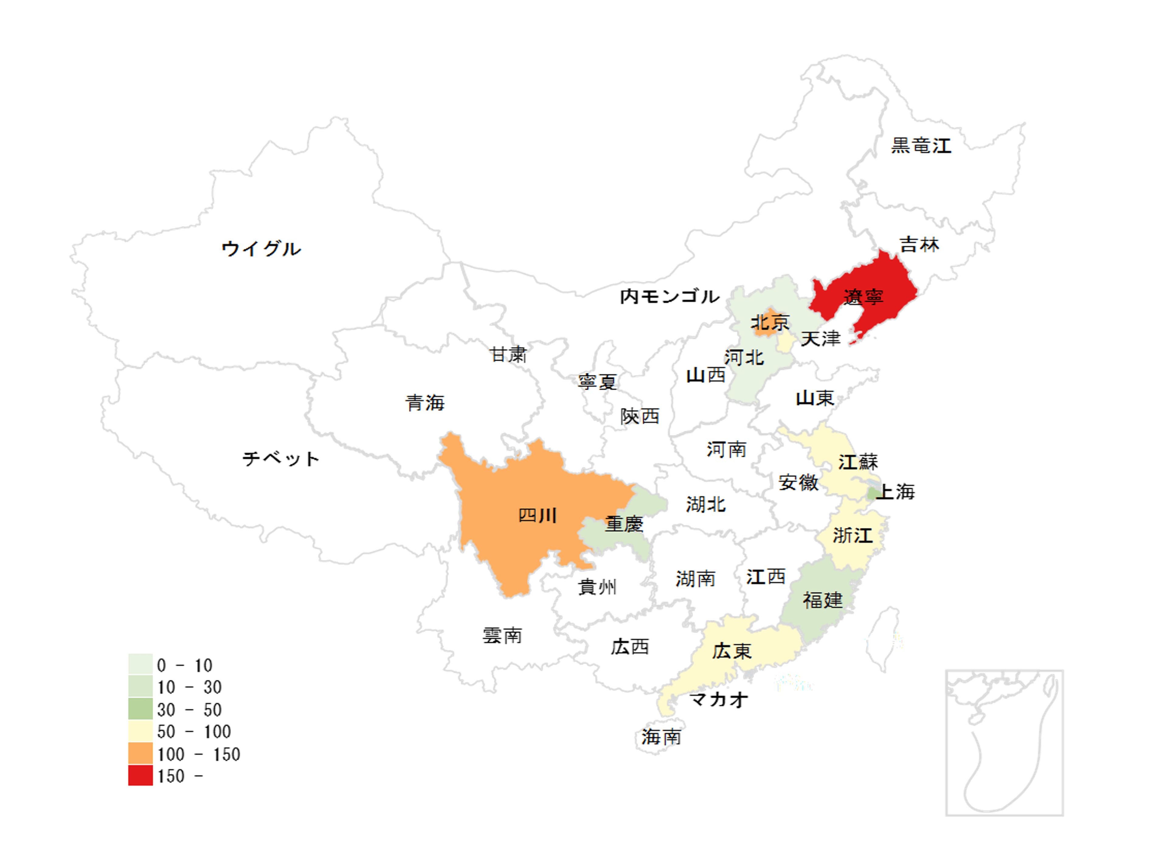 地域別は、「遼寧省」(社数162社、18.7%)に最も集中しており、次いで「北京市」(139社、16.1%)、「四川省」(103社、11.9%)と続き、この3地域で全体の4割強を占めています。(表3)また、遼寧省では、大連市(77社)と瀋陽市(77社)と2エリアに企業が密集しています。