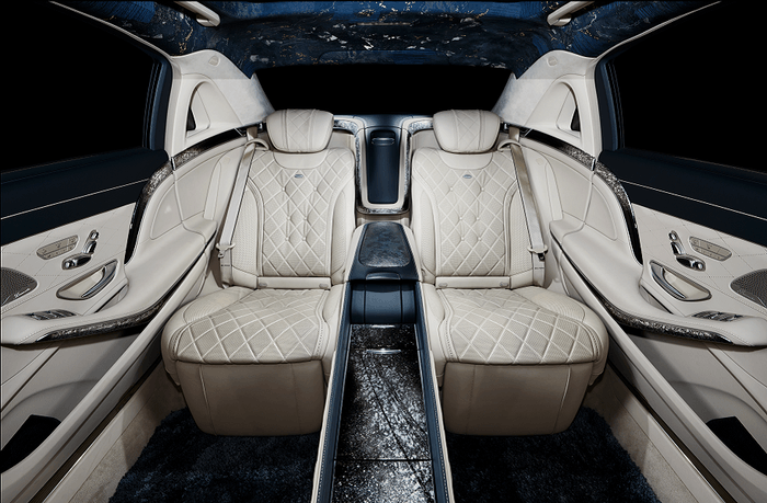 威厳あるスリーポインテッドスターを散りばめ西陣織で彩るルーフライニング。前方のサンルーフを開けると、箔で表現した時空を歪めるプラズマの如く魅惑的な宇宙の姿が現れます。 ゲストを囲むインテリアパネルは引箔模様を施し、シートバックのトリムには引箔の上に漆芸による高蒔絵を施しました。繊細で力強い表現は見るものを魅了します。 センターコンソール部分には、レザーをテキスタイルとして織込んだ贅沢な素材を起用しています。 フロアマットは毛足が長く踏み心地の気持ちいいシャギーマット。