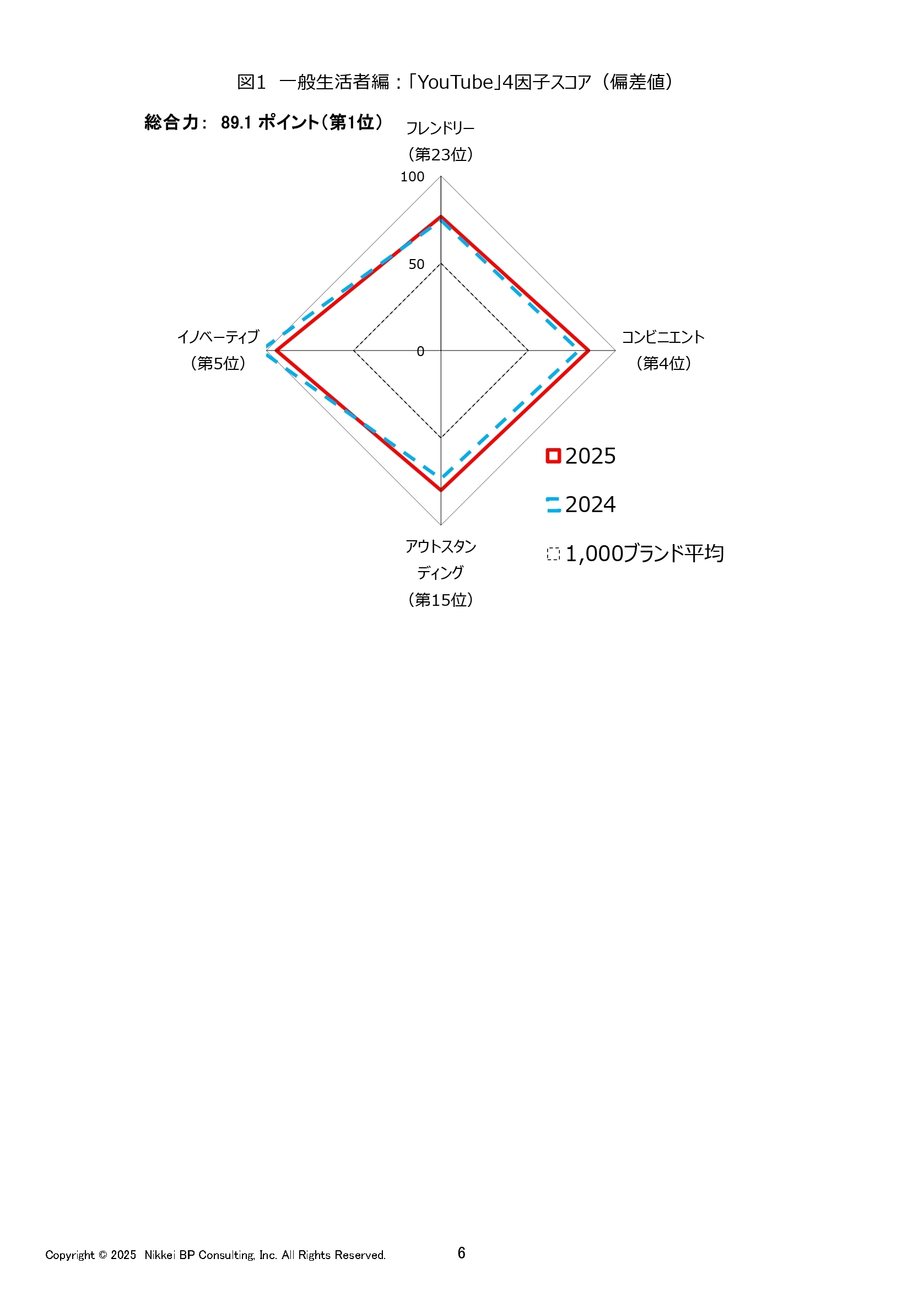 日経BPコンサルティング調べ 「ブランド・ジャパン2025」調査結果発表 消費者が選ぶ強いブランド、 YouTubeが「総合力」ランキングで4度目の首位に 上昇ランキング上位に、ローソン、Netflix、生茶など