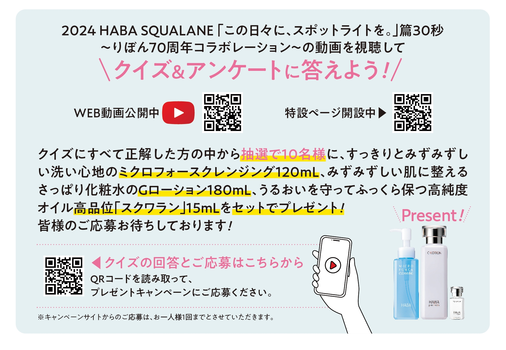 WEB動画『いつのあなたにも、いちばんそばで。HABA SQUALANE』~「この日々に、スポットライトを。」篇30秒~を視聴。回答フォームより3問のクイズとアンケートに答えて応募が完了となります。