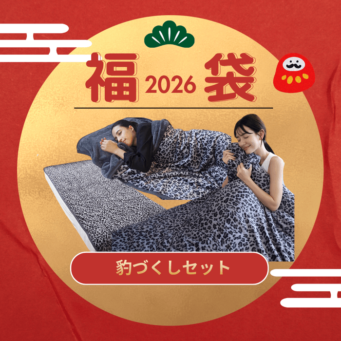 今年は5種類の福袋を展開。マットレスと枕、それぞれのカバーがセットになった「神選」福袋をはじめ、人気なマットレスピローとアウターカバーのセットやヒョウ柄のあったか素材の軽寝具セットなどを販売いたしております。