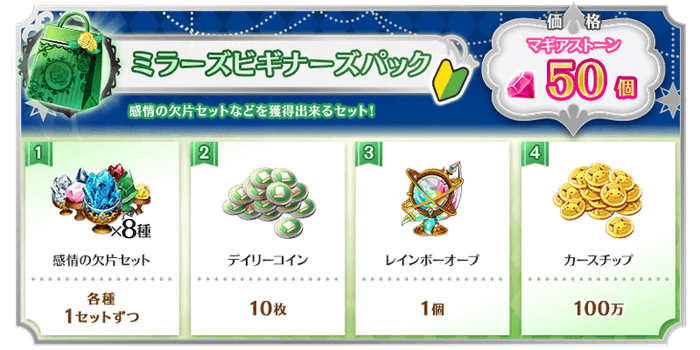 無償を含むマギアストーンで購入できる「ミラーズビギナーズパック」には以下のアイテムが封入されています。