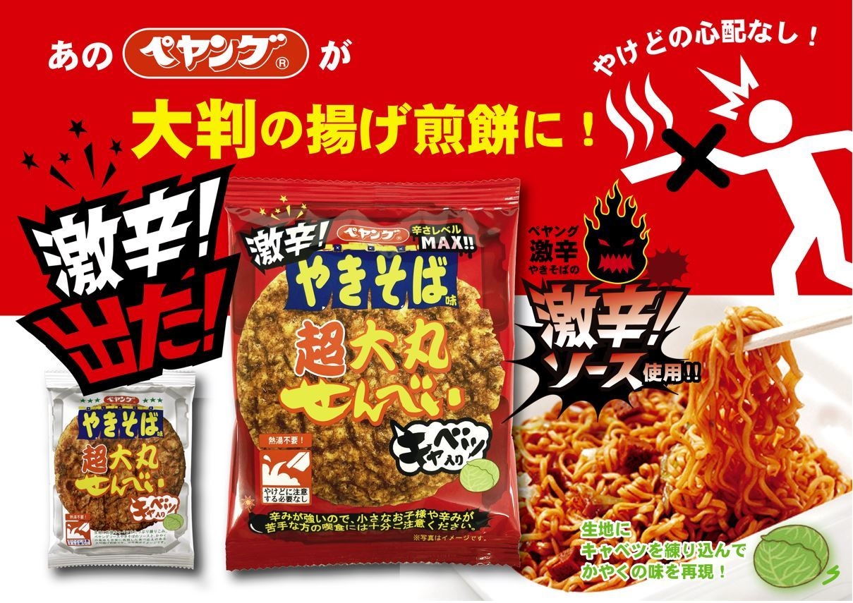 特徴 :「ペヤング激辛やきそば」の辛みと風味をしっかりと再現した揚げ煎餅です。煎餅の生地に「ペヤングソースやきそば」で使用されているキャベツを練り込み、後に引く味わいを演出しています。