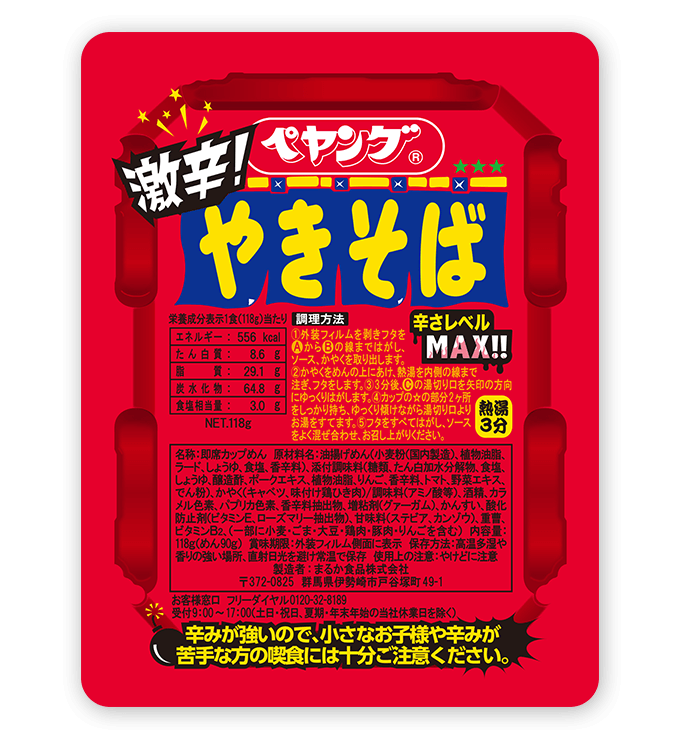 まるか食品のロングセラー商品「ペヤングソースやきそば」のシリーズ品として2012年に発売された「ペヤング激辛やきそば」は、当時「激辛」と書いてあっても辛くない商品ばかりだった市場に、辛さレベルMAXを謳い本当に辛いやきそばとして登場して大好評を博し、現在まで続くロングヒット商品です。2016年に発売された「ペヤング超大盛やきそばハーフ&ハーフ激辛」も人気の定番商品となっています。