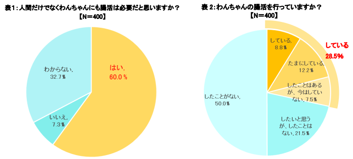 また、「わんちゃんにも腸活が必要」は60%。実際に腸活を取り入れている人は、約3割(28.5%)にとどまっているものの、人間と同様に、今や愛犬も健康のためには腸活が常識となりそうです。