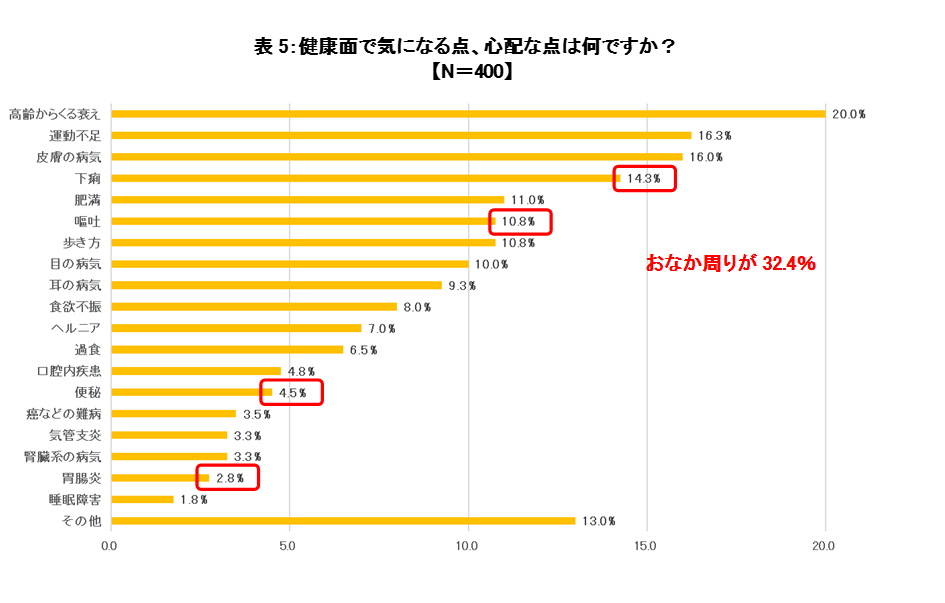 愛犬の健康状態について聞いたところ、「健康」と、健康に不安を感じている人がほぼ半数ずつという結果に。飼い主さんの約半数(49.0%)は、「時たま心配なこともある」「あまり健康ではない」「健康ではない」と、愛犬の健康を気遣っています。具体的に気になる点、心配な点で最も多いのは、おなかの健康で、全体の32.4%。