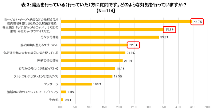 ◆腸活で実践しているのは、「ヨーグルト・チーズ・納豆など発酵食品」(44.7%)、「善玉菌を増やす食物」(35.1%)が上位に。「腸内環境を整えるサプリメント」も22.8%と人気。