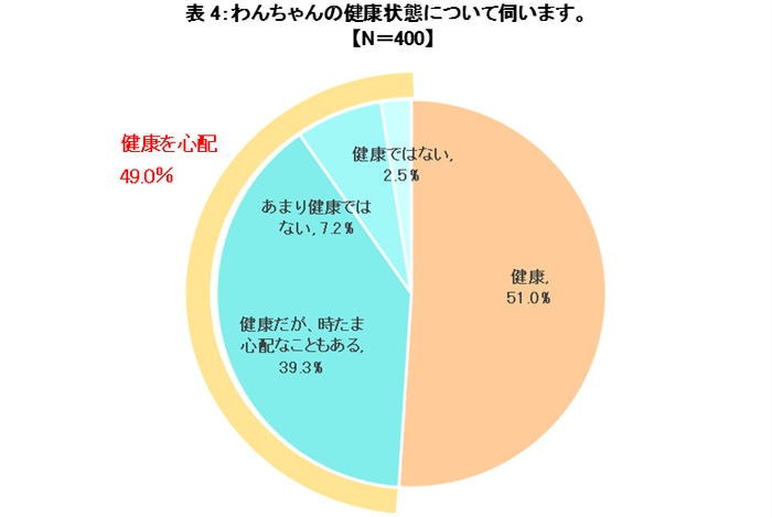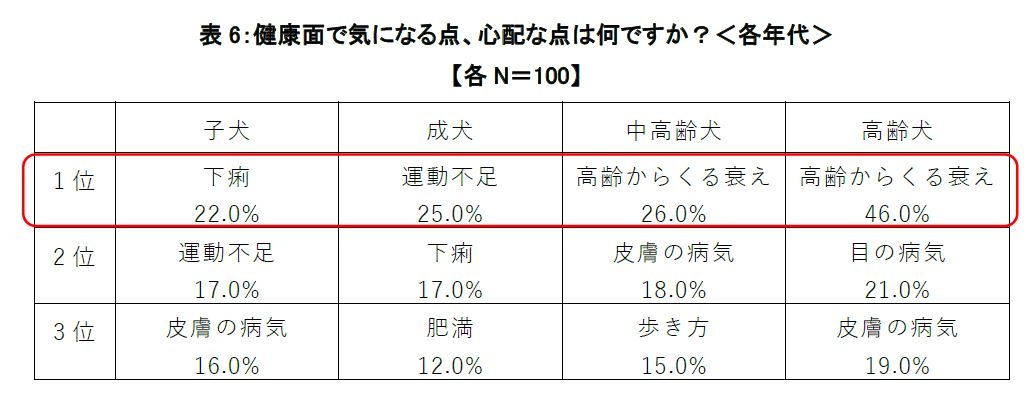その結果、飼い主さんの約半数(49.0%)が愛犬の健康を気遣っており、子犬は「下痢」、成犬は「運動不足」、中高齢犬・高齢犬は「高齢からくる衰え」を心配していました。
