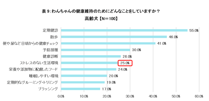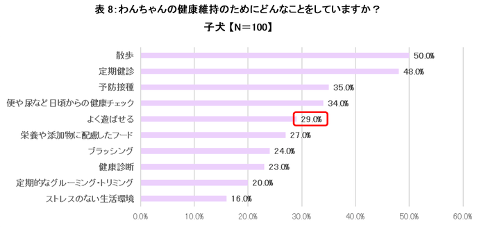 わんちゃんの健康維持のためにどんなことをしているのかを聞いたところ、「散歩」(48.5%)、「定期健診」(48.3%)、「便や尿など日頃からの健康チェック」(38.3%)と続きました。健康やストレス解消のために欠かせない「散歩」の回答が少ないのは、健康管理のためというより、当たり前の習慣として日常化しているからかもしれません。年代別では「よく遊ばせる」(子犬の5位、29.0%)、「ストレスのない生活環境」(高齢犬の6位、25.0%)といった声もありました。