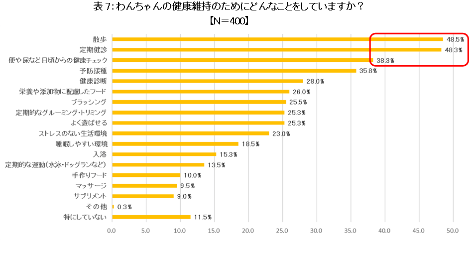 ◆健康維持のためにしていることは「散歩」(48.5%)がトップ。続いて「定期健診」(48.3%)、「便や尿など日頃からの健康チェック」(38.3%)が上位に。