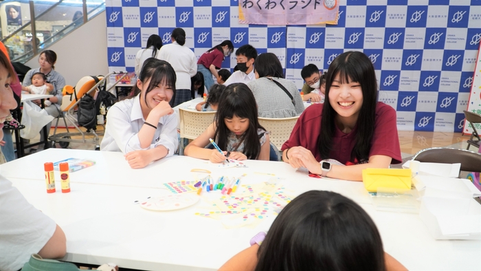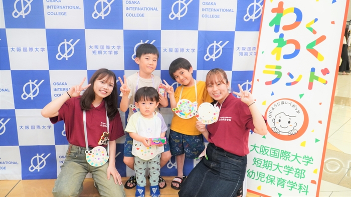 大阪国際大学短期大学部(大阪府守口市、学長 宮本郁夫)幼児保育学科では、地域連携で取り組む子育て支援活動「わくわくランド」を開催しています。この活動の趣旨は、京阪沿線で本学が唯一の保育者養成校であるため、地域と連携して、地域の若者を育て、地域の園に還すという「子育て基盤づくり」にあります。今回、大阪国際高校の幼児保育進学コース生と短期大学部幼児保育学科生で初めて合同開催しました。守口市内のイオンモール大日との連携では4回目となります。来場の親子は70組(190名)となり、多くの方々にご来場いただき大盛況でした。