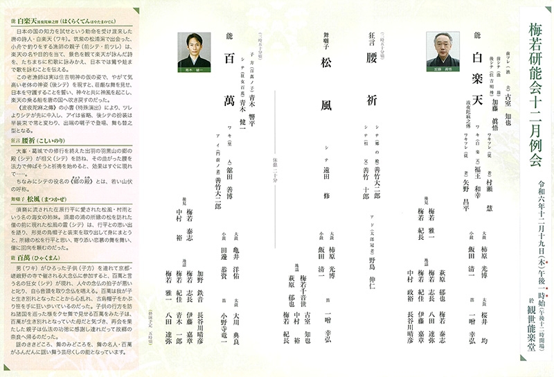 能「百萬」を青木健一・響平の親子で出演。謡のききどころ、舞のみどころを舞の名人・百萬がふんだんに謡舞う芸尽くしの能となっております。