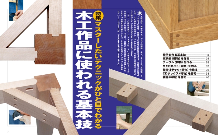 イス、テーブル、収納棚など、ぜひDIYでつくってみたい木工家具を、現役の木工家具職人がわかりやすく解説。きれいに仕上げるためのさまざまテクニックを写真入りで紹介しています。