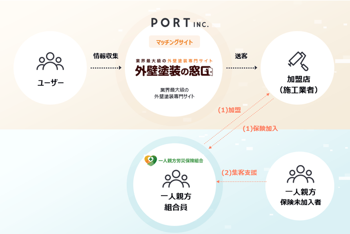 一人親方労災保険組合に加入している組合員の中で、塗装業を営む方に対して、「外壁塗装の窓口」の加盟を促進して参ります。「外壁塗装の窓口」の加盟店は、一人親方など、個人で営業されている方も非常に多くご利用いただいております。そのため、一人親方労災保険組合に登録されている、塗装業の方、約5,800人に対して、「外壁塗装の窓口」の加盟店への登録を案内し、送客先の拡大につなげていきます。また、「外壁塗装の窓口」の加盟店に対しても積極的に一人親方労災保険への加入を促進していきます。一人親方労災保険のオプションがあることで、新規の加盟店の増加にもつながると考えております。