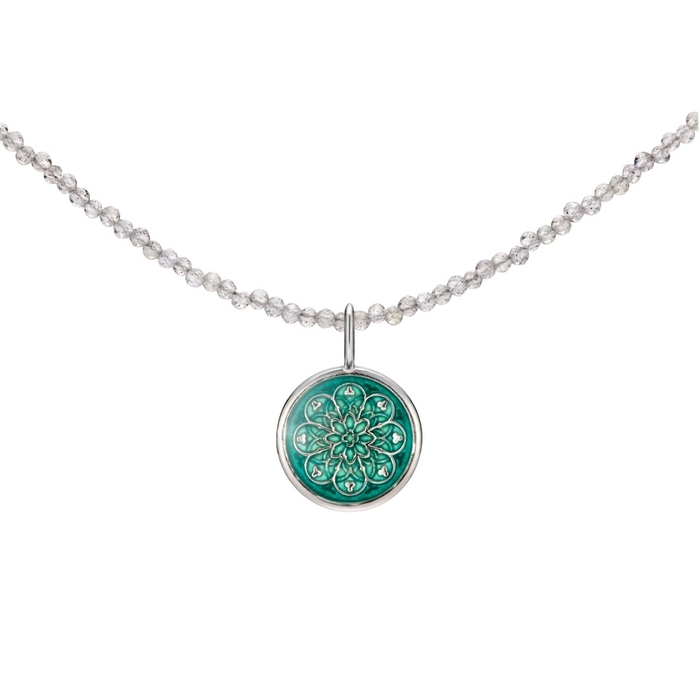 このほどの新作は、ゴシック建築などに見られる円形のステンドグラス“バラ窓”をモチーフにしたペンダントトップです。ベースとなる金属の高低差により樹脂の色味に濃淡が生まれ、美しい模様が浮かび上がります。ステンドグラスから射し込む“希望の光”に想いをこめて、大切な方への贈り物や自分へのご褒美としてもおすすめのデザインです。