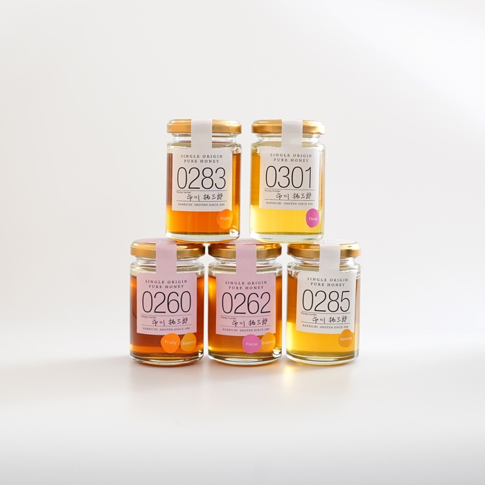 山形県産さくらんぼ蜂蜜、北海道産菩提樹蜂蜜、メキシコ産オレンジ蜂蜜など。各140g×5個。