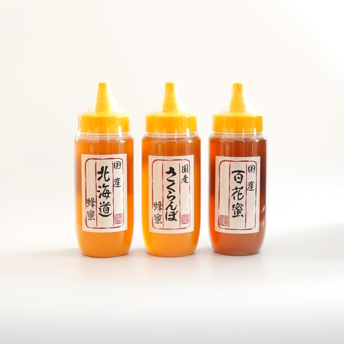 国産さくらんぼ蜂蜜、北海道蜂蜜など。各500g×3本