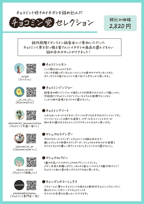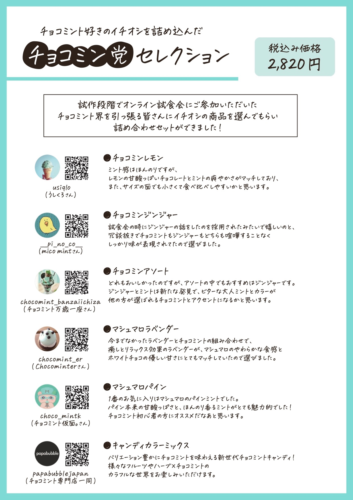 ポップでかわいいボックスに入った「チョコミン党セレクション」。今回セレクションに参加したのは、発売前のチョコミントオンライン試食会参加メンバーでチョコミント界をひっぱる5名のチョコミン党と、青山のチョコミント専門店スタッフ。