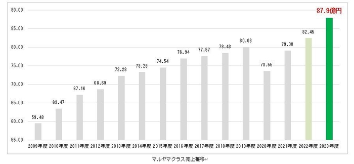 マルヤマクラスは2009年に開業、開業初年度の年商59.5億円以降、10年連続で増収し2019年度には80億円を突破。新型コロナウイルス禍を経て2022年度には2019年度の最高売上を更新し、2023年度も前年比106.6%と大きく記録を更新、2024年3月度時点では単月ごとの過去最高売上を16か月連続で記録している。