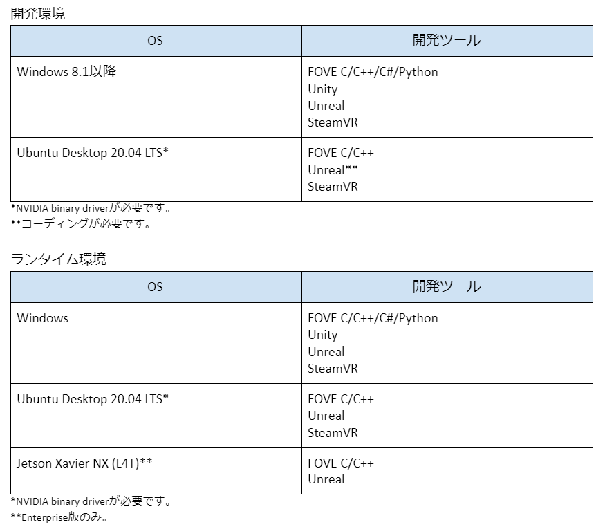FOVE VR Platformの開発環境・ランタイム環境は以下の通りです。