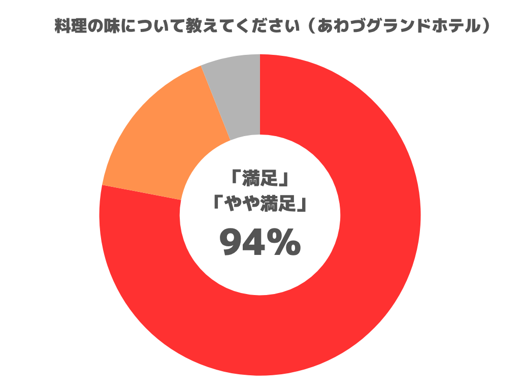 開始後に実施したお客様アンケートにおいて、「あわづグランドホテル」「ホテル蘭風」の2施設ともに料理満足度90%超えという高い評価を獲得したことをご報告いたします。さらに、同アンケートでは来館目的が「大江戸三つ星バイキング」であったお客様が80%を超え、本バイキングがホテルを選ぶ上での動機となっていることが明らかになりました。
