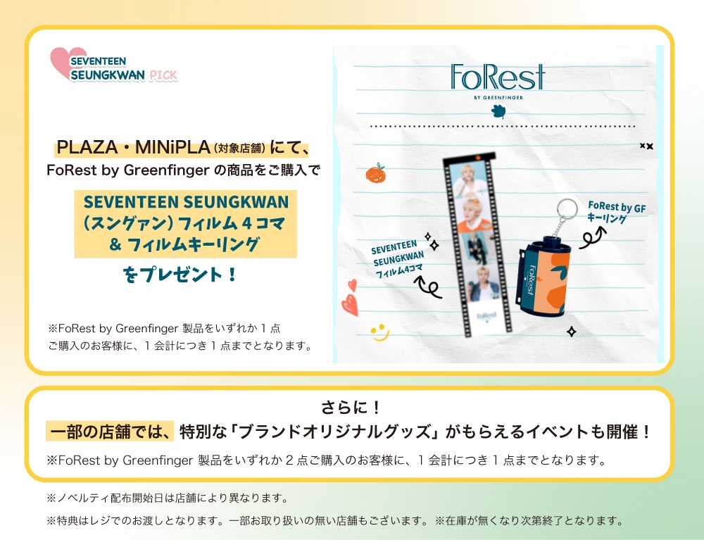 (※SEUNGKWAN(スングァン)フィルム4コマ+フィルムキーリングはFoRest by Greenfinger製品をいずれか1点ご購入のお客様に、1会計につき1点までとなります。)