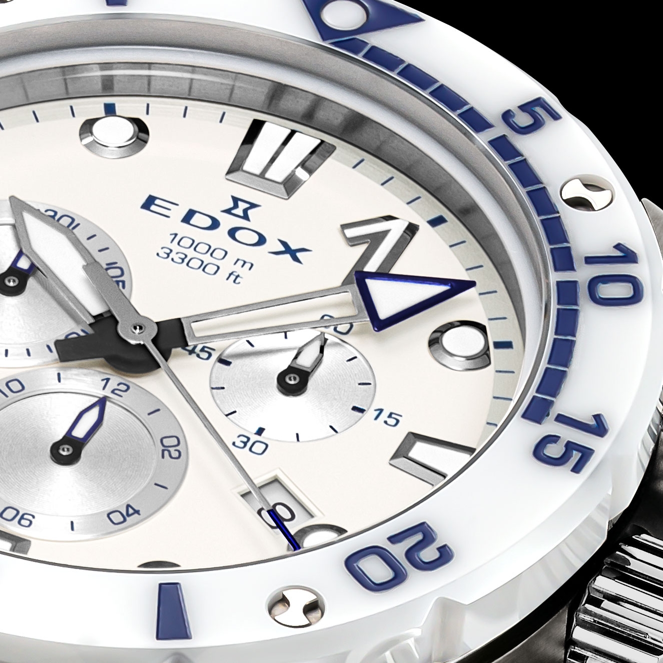 最高速度が200km/hを超え、海のF1とも称されるパワーボートレースのダイナミックかつラグジュアリーな世界観を投影した、エドックスのフラッグシップコレクションです。厚さ3.5mm以上の重厚なセラミックベゼルや300~1000m防水を標準スペックとして備え、素材や仕上げへの一切の妥協を許さず審美性を追求することで、タフネスとエレガンスを両立しています。