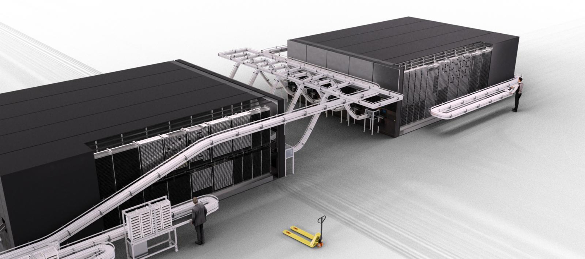 独自*4の“DISR(Direct Item Storage & Retrieval)”(直接物品保管と取り出し)により、“Order-To-Person”もしくは“Order-To-Box”(別称“Single-order picking”)つまり注文中の全品点数がピッキングされ、作業者へ、または直接出荷カートンへの払出しを可能にします。これは従来の商品が入ったコンテナ等が人に運ばれ、人がコンテナ等からピッキングすることを注文内にある品点数分行う“Good-To-Person”との大きな違いです。