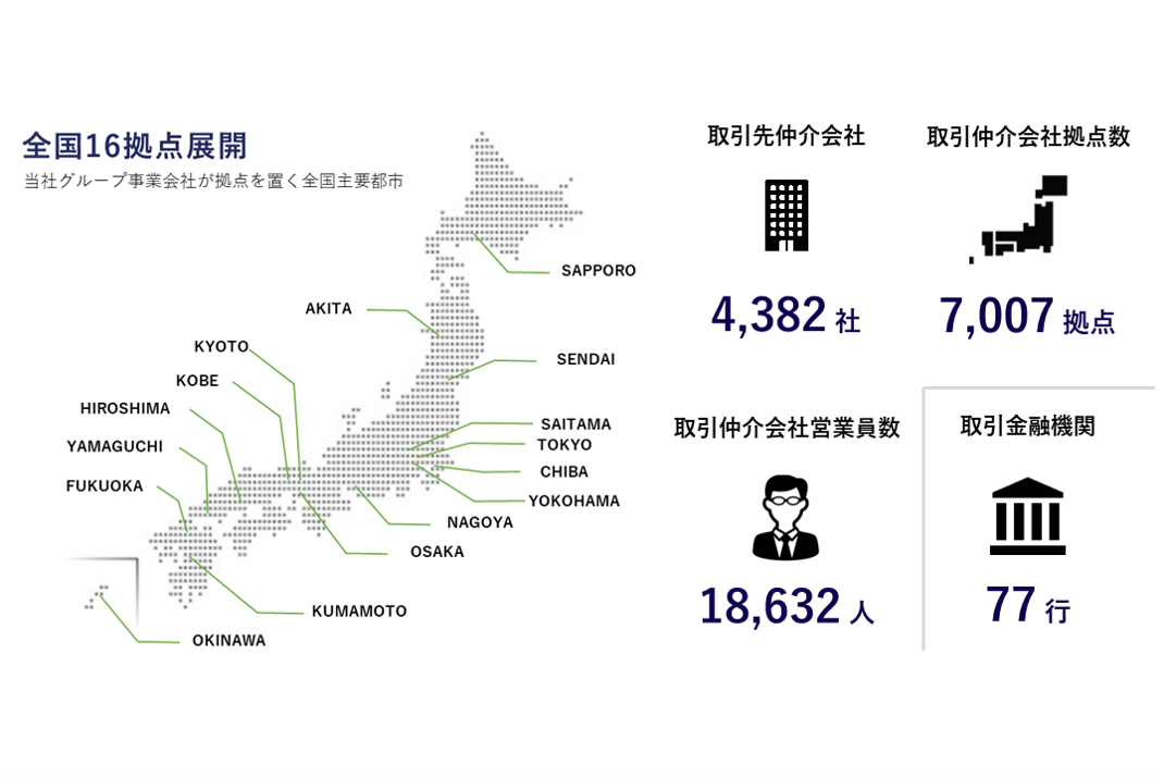当社グループは、引渡し累計10,000件を超える中古住宅事業と戸建住宅事業のリアルな取引を通じて蓄積してきた不動産情報のデータベースを有しており、当社グループが全国に展開する拠点の先にある仲介会社ネットワークを介した情報の受け渡しと、テクノロジーとしてのAI査定やポータルサイトの機能をも有している『KAITRY』にて直接一般顧客と繋がることで幅広い不動産情報を取り扱っております。