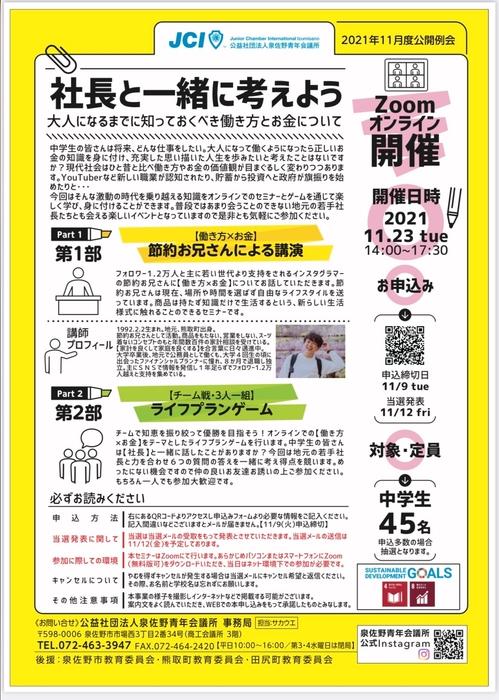 社長と一緒考えよう!泉佐野青年会議所が地元中学生向け “大人になるまでに知っておくべき働き方とお金について” 学べるセミナーをZoomにて11月23日(火祝)に開催