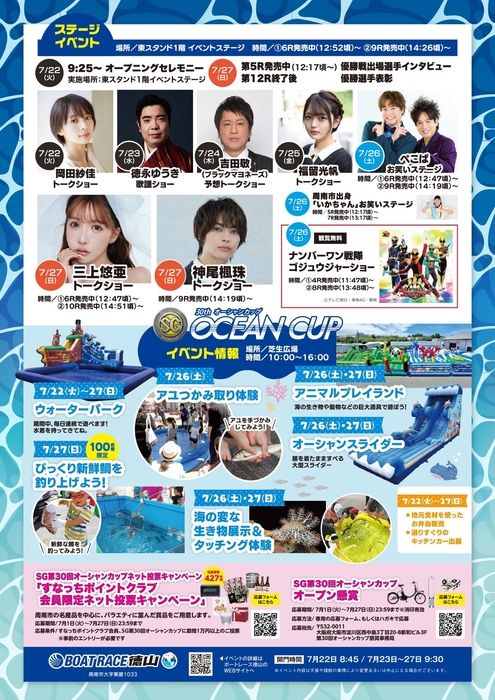ボートレース業界の注目度の高いSGレースの一つである「オーシャンカップ」は、今年で30回目の節目を迎えます。今回のオーシャンカップ関連イベントでは、老若男女問わず楽しめる多彩なプログラムを用意しています。特に注目は、特別ゲストによるステージイベントです。人気芸能人による、トークショーやミニライブなど、レース観戦だけでなく、来場者が一日中楽しめる魅力的なイベントとなっています。