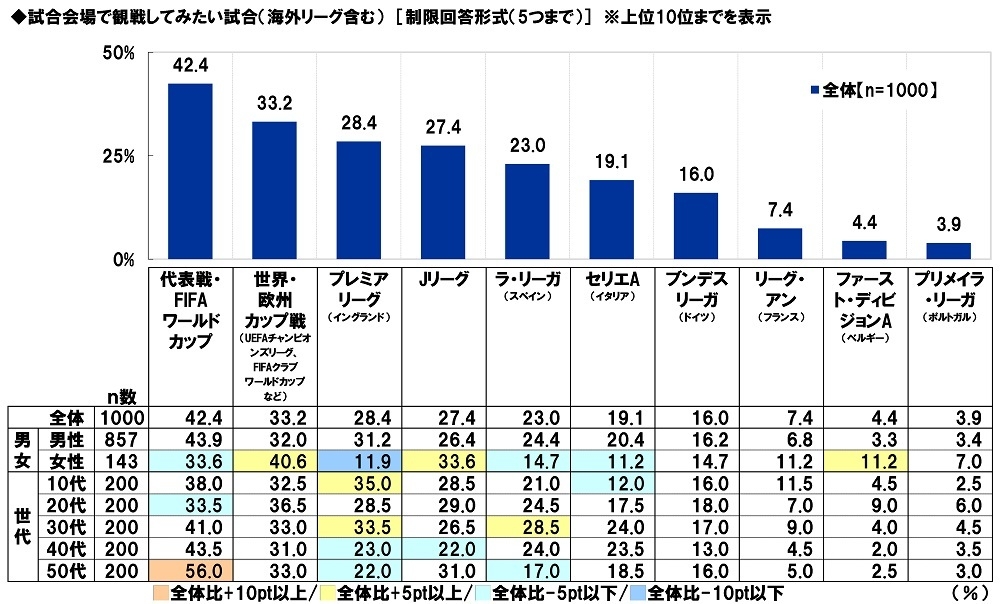 試合会場で観戦してみたい試合(海外リーグ含む)を聞いたところ、「代表戦・FIFAワールドカップ」(42.4%)が最も高くなり、「世界・欧州カップ戦(UEFAチャンピオンズリーグ、FIFAクラブワールドカップなど)」(33.2%)、「プレミアリーグ(イングランド)」(28.4%)、「Jリーグ」(27.4%)、「ラ・リーガ(スペイン)」(23.0%)が続きました。