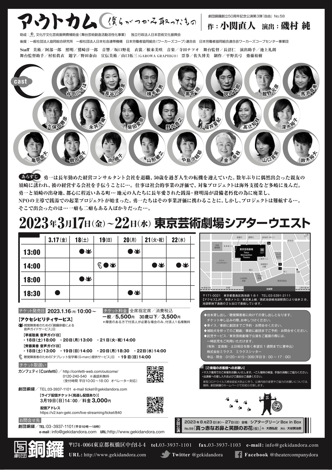 劇団銅鑼創立50周年記念公演第三弾「アウトカム~僕らがつかみ取ったもの~」記念公演のラストを飾るのは、劇団座付き作家の小関直人の作品。創立以来、創造理念としてきた「本当に人間らしく生きることとは何か」という原点に立ち、人間の尊厳が守られる社会の実現に尽力する人たちの姿を通して「人々に優しい社会」とはなにかを問いかける作品です。
