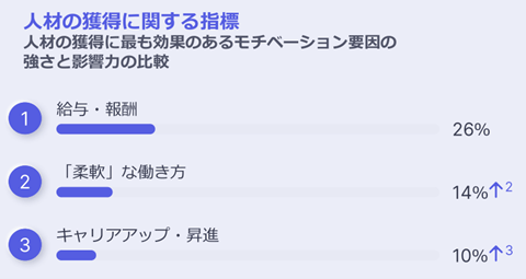 回答には様々な声が挙げられ、「柔軟な働き方」から「経営陣」まで幅広い10個の要因が浮き彫りになり、1位に「給与・報酬」、2位に「柔軟な働き方」(2022年と比較して2ランクアップ)そして3位に「キャリアアップ・昇進」(2022年と比較して、3ランクアップ)が挙がり、給与・報酬が今もなお一番の要因となっています。事実、回答者のうち59%が「求人広告で最も影響力のある情報は給与である」と回答し、人材獲得要因として3位に挙がった「キャリアアップ・昇進」と比較をしても給与は約2.6倍もの影響力があり、その重要性は依然として高いままです。