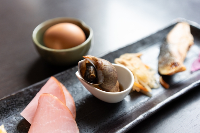 新潟県産の黒ばい貝の旨煮。新潟県産コシヒカリと一緒にお召し上がりください。