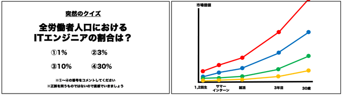 本講義は、ITエンジニアを目指す学生のキャリア支援を目的として、これまで様々な学校の情報系学部の学生向けに実施されてきた「ITエンジニア就活の極意」を京都橘大学・工学部情報工学科の1,2回生向けにカスタマイズして実施されたものです。京都橘大学では初めての実施となります。