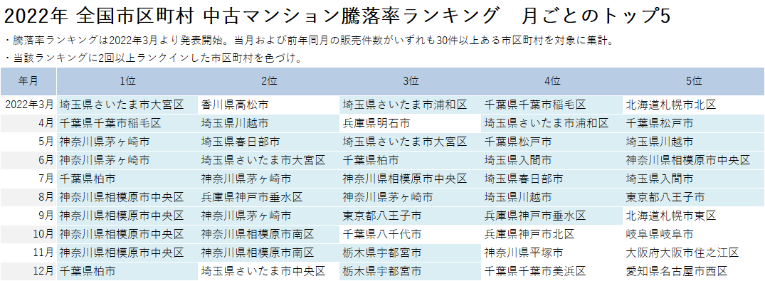 「マンションレビュー」のプレスリリースで注目エリアの1年を振りかえり! 全国市区町村 中古マンション騰落率ランキング 2022年の上位市区の相場を調査