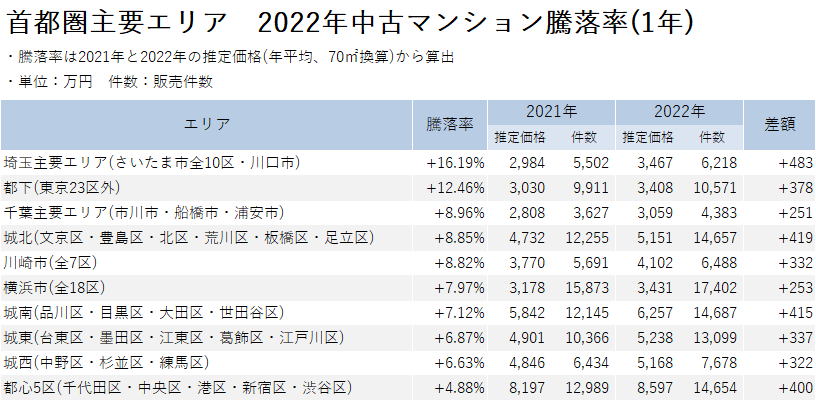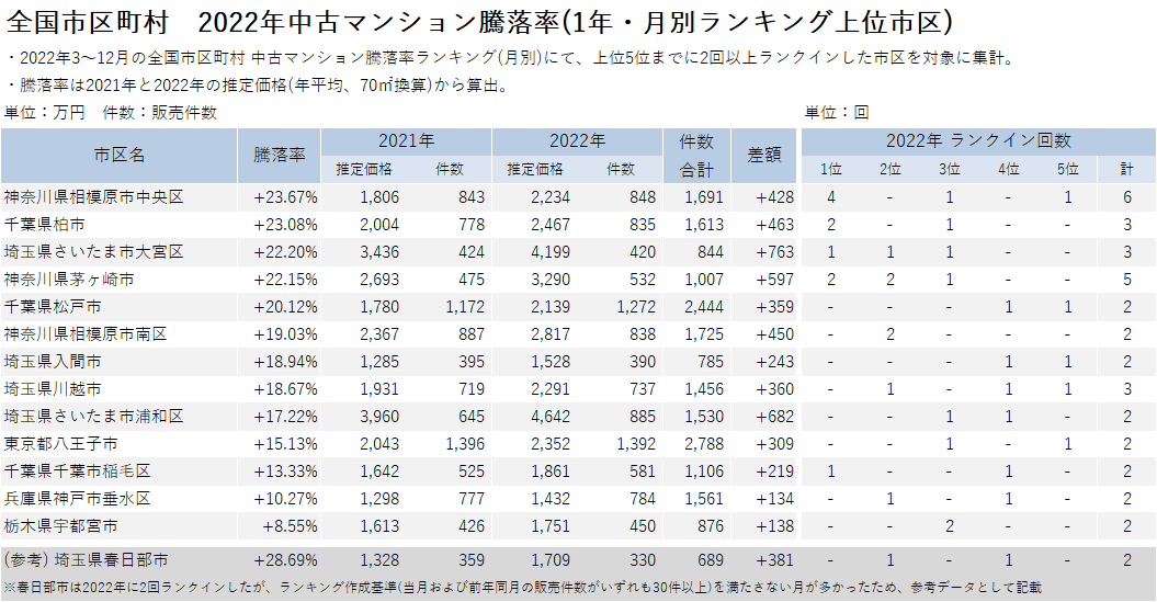 その第2弾として、2022年の中古マンション騰落率ランキング上位に複数回ランクインした市区について、2021年と比較した1年での騰落率を調査。また、毎月相場推移を発表している都道府県および首都圏主要エリアにおける騰落率についても、1年を通したデータでの調査を行いましたので発表いたします。