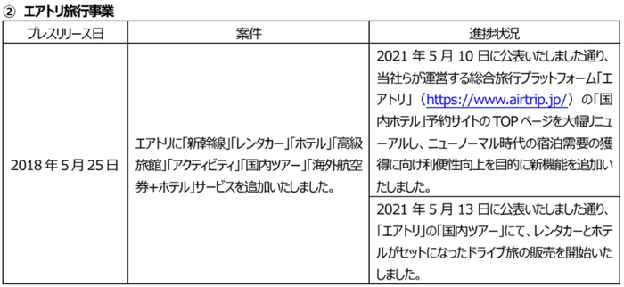 プレスリリース案件の進捗状況に関するご報告2021-06-14 17:00株式会社エアトリ当社はこれまでに発表いたしましたプレスリリースの各案件につき、6月1日時点において進捗がありました主な案件の状況について、以下の通りご報告いたします。■各案件の進捗状況https://www.airtrip.jp/画像・ファイル一覧一括ダウンロード