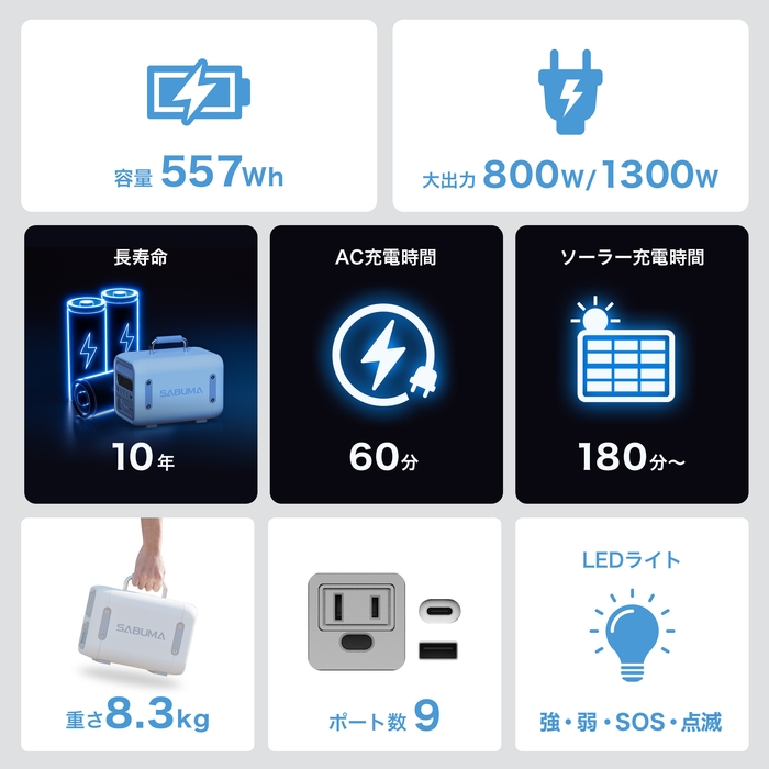 株式会社アピロス(本社:東京都港区)は、5月に一般発売を予定しているSABUMAブランドのポータブル電源 第2弾「SABUMA(サブマ)S600」と、その周辺アクセサリーをセットにした「アクセサリーセット」、さらにソーラーパネルを加えた「ソーラーセット」などの商品をSABUMA公式ストアにて3月10日正午より先行予約購入を開始しました。