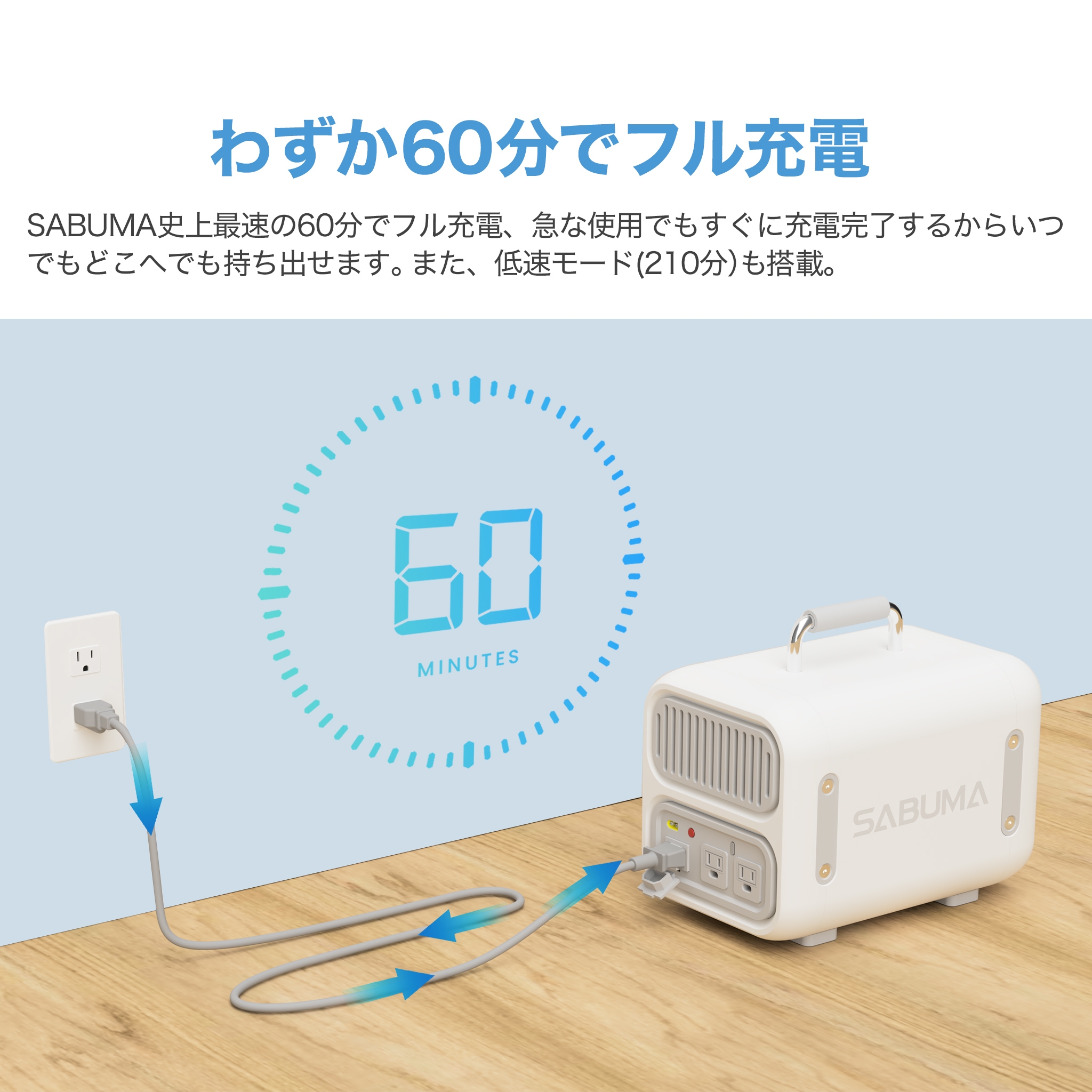 ・SABUMA史上最速!約1時間の急速充電でいつでもどこでも持ち出せる(低速 約3.5時間)