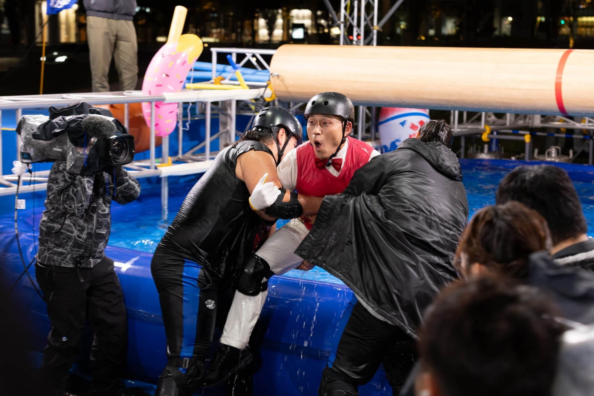 そして恒例の真冬の屋外プール競技は「やれんのか!極寒水上一本橋デスマッチ」。丸太橋の上で格闘家ぜひらーと名物ぜひらーが激突!誰が最後まで丸太の上にとどまっていられるのか?極上の肉弾戦を繰り広げます!