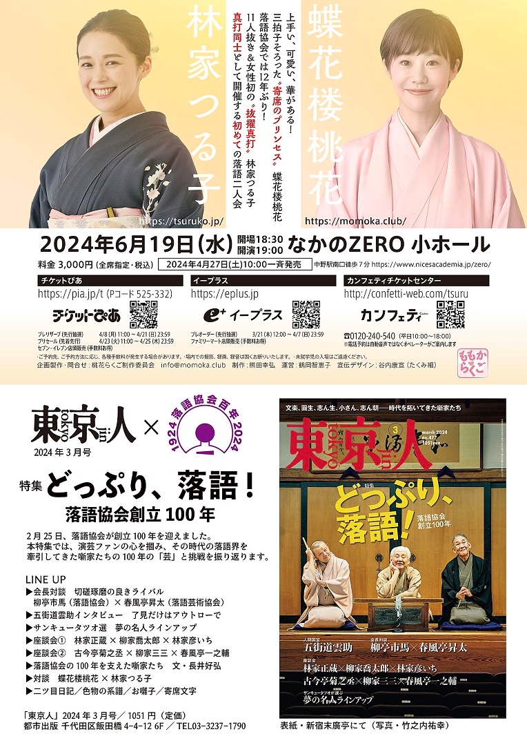 桃花らくご制作委員会主催、『蝶花楼桃花 林家つる子 二人会』が2024年6月19日 (水)になかのZERO 小ホール(東京都中野区中野2丁目9番7号)にて開催されます。チケットはカンフェティ(運営:ロングランプランニング株式会社、東京都新宿区、代表取締役:榑松 大剛)ほか各プレイガイドにて2024年4月27日(土) 10:00より予約受付開始です。