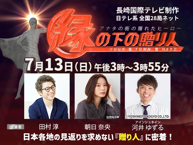 株式会社長崎国際テレビ(本社:長崎県長崎市、代表取締役社長:川畑 年弘)は、日本各地に存在する、見返りを求めない縁の下の『贈り人』の謎を解明するドキュメントバラエティー『アナタの街の隠れたヒーロー 縁の下の贈り人』(日本テレビ系28局ネット)を2025年7月13日(日)午後3時から放送します。