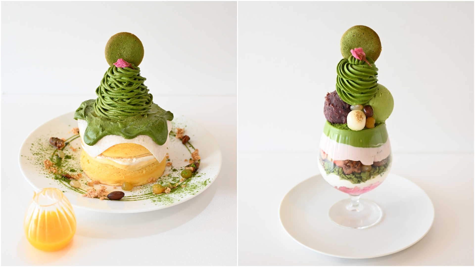 濃さの違う2種類の抹茶クリームと求肥をのせた贅沢なパンケーキです。中には抹茶アイス、さくらアイスが隠れております。オレンジソースでさっぱり召し上がれます。