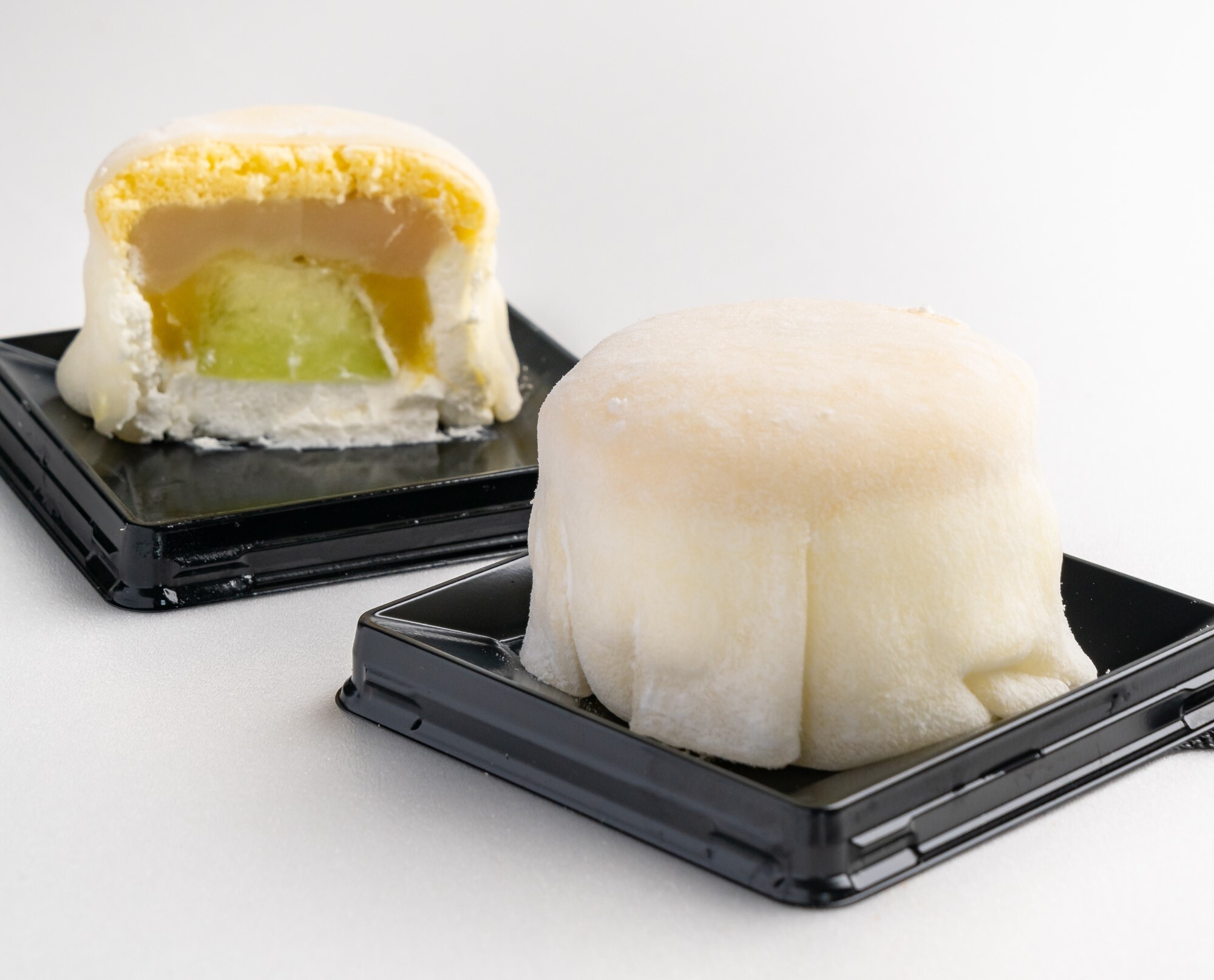 メロンの果肉、さつまいもペースト、白あん、スポンジ、生クリームを求肥で包んでいます。茨城県産のメロンに合うクリーム大福です。