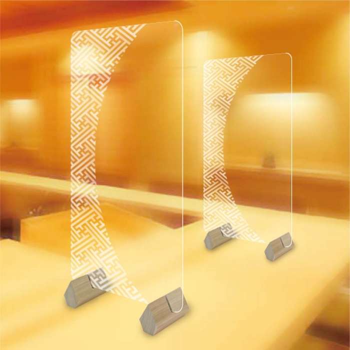 あたりまえのような透明アクリルパーテーションに飽きてしまった方へ、今までにない和風柄デザインの木製足付きアクリルパーテーションを開発しました。